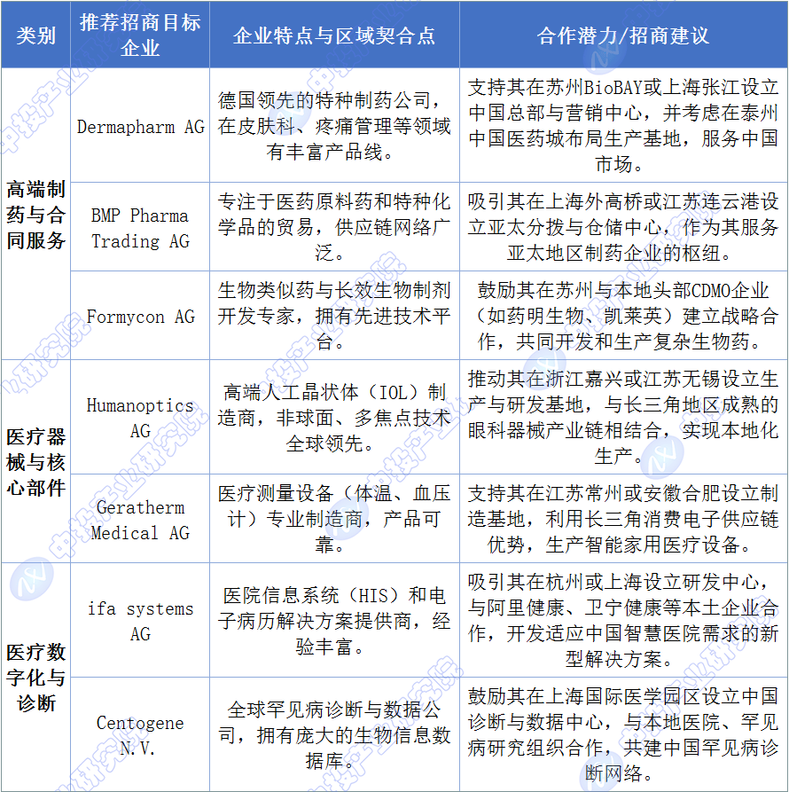 长三角地域应阐扬其财产链完整、本钱活跃、国际化程度高的分析劣势,努力于吸引可以或许融入并强化其“研发-制制-办事-贸易”全链条的企业。上海的国际金融取研发核心地位、姑苏的生物医药财产集群、杭州的数字经济取南京的化学根本,为企业供给了从研发合做、规模化出产到市场开辟的全方位可能。招引沉点正在于高端制药取CDMO、高机能医疗器械取焦点材料以及医疗数字化处理方案。可操纵长三角一体化示范区政策,指导企业正在上海设立中国总部取研发核心,正在姑苏、泰州等地结构出产,正在杭州、合肥等地开展数字化合做。例如,制药企业Dermapharm AG可正在长三角成立区域出产和发卖;专注于医药原料商业的BMP Pharma Trading AG可于此设立亚太分拨核心;同时医疗数字化企业i systems AG可取当地数字健康企业合做。