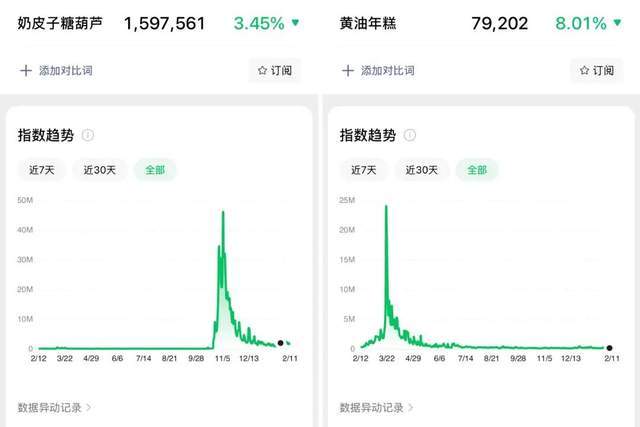 从微信指数来看,奶皮子糖葫芦因季候属性,更适配秋冬场景,目前尚能维持必然的热度;固体杨枝甘露大要维持了一周摆布便敏捷降温,曾刷屏的黄油年糕热度冲至颠峰后仅半个月,微信指数几乎归零。