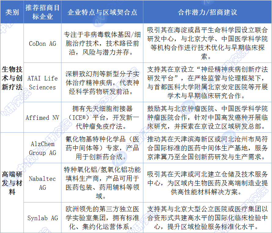 京津冀地域招引策略应依托的科研院所、丰硕的临床资本取政策高地劣势,聚焦原始立异取高端。强大的根本研发实力(如大学、生命科学研究所)和全国领先的医疗机构收集(如协和病院、大学第一病院等国度医学核心),为衔接前沿生物手艺供给了“试验场”取合做伙伴。招引沉点应放正在需深度对接临床取科研资本的立异疗法研发(如细胞基因医治、神经疾病新药)和高端研发办事(如特种化学品、临床试验处理方案)范畴。可指导相关企业正在设立研发核心或临床研究总部,正在天津、结构中试取出产,构成“研发-津冀”的协同款式。典型方针企业包罗努力于非病毒载体基因医治的CoDon AG、开辟新型疾病疗法的ATAI Life Sciences,可鞭策其取当地科研机构共建结合尝试室。同时,特种化学品企业AlzChem Group AG的医药两头体、Nabaltec AG的高机能材料,可办事于区域内的研发取高端制制需求。
